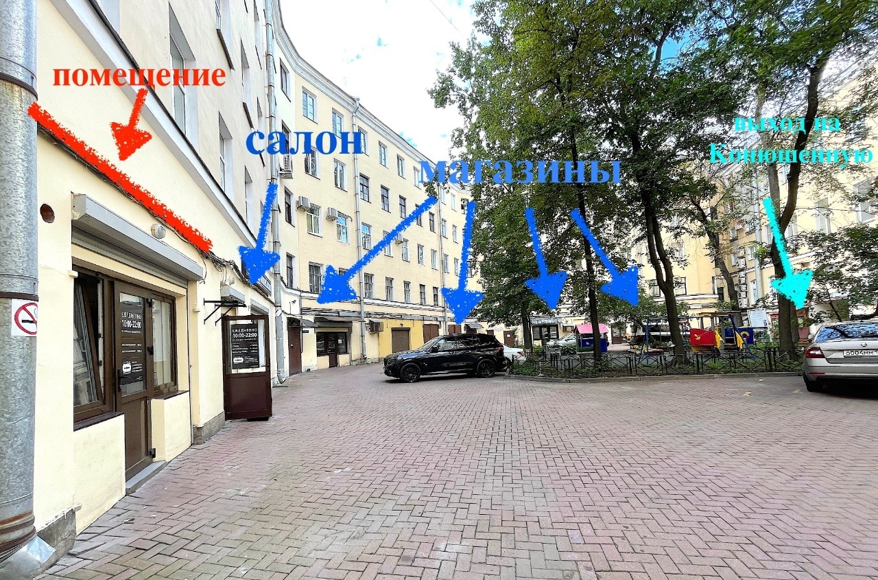Идеальное состояние, максимально функциональная планировка - прямоугольник без капитальных стен внутри, и капитальные стены по периметру помещения. Арка из двора выходит на Конюшенную площадь: с одной стороны постоянно растущий (даже в пандемию) трафик туристов и горожан, с другой - реальная возможность парковаться на площади, уникальное сочетание для «золотого треугольника».
