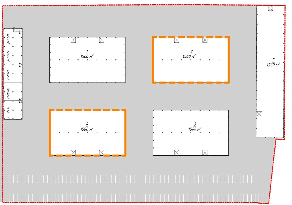 - Площадь: 750–1500 м² (прямоугольная форма).