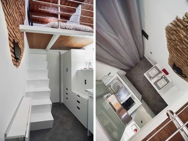 На третьем месте расположилась студия в центре Рима. Её площадь составляет около 7,2 м2. Организацией внутреннего пространства занимался сам владелец недвижимости, архитектор по образованию. Уместить всё необходимое в ограниченном пространстве удалось за счёт создания второго уровня — благо, высота потолков это позволяет.