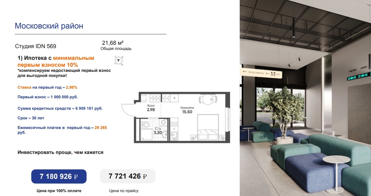 Студия 21,68 м² в Московском районе с ипотекой от 2,98% и минимальным первым взносом от 1 млн ₽. Цена при 100% оплате — 7,18 млн ₽. Удобный формат для инвестиций или первого жилья.