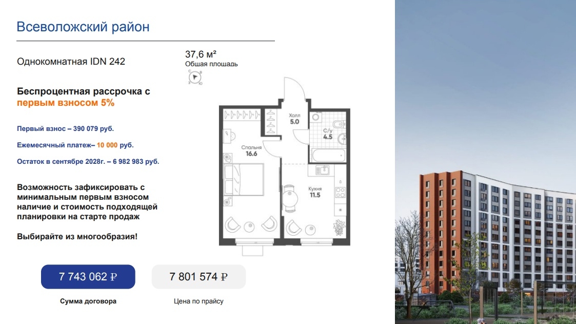 Однокомнатная квартира 37,6 м² во Всеволожском районе с рассрочкой от 5% и ежемесячным платежом 10 000 руб. Старт продаж — зафиксируйте выгодную цену!