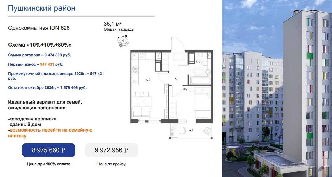 Однокомнатная квартира 35,1 м² в Пушкинском районе по схеме 10%+10%+80%. Сданный дом, городская прописка, подходит под семейную ипотеку.