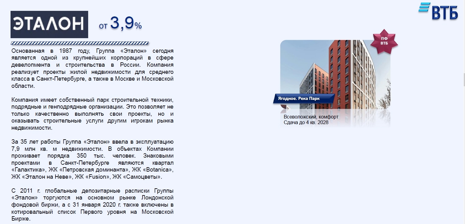 Группа «Эталон» — один из лидеров девелопмента России. 35 лет опыта, 7,9 млн кв. м построенной недвижимости, проекты в Москве и Санкт-Петербурге. Ипотека от 3,9% от ВТБ. ЖК «Ягодное. Река Парк» — комфорт-класс, сдача до 2028 года.