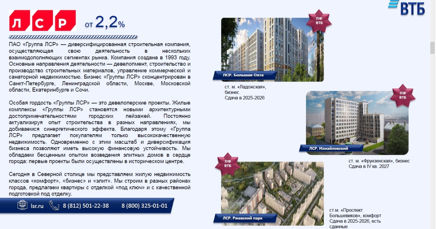 ЛСР и ВТБ предлагают ипотеку от 2,2% на объекты бизнес и комфорт-класса: ЛСР Большая Охта, Измайловский, Ржевский парк. Квартиры в Санкт-Петербурге с отделкой и выгодными условиями кредитования.